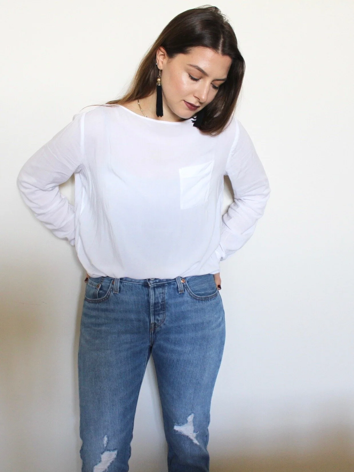 Not only are knits super warm, but they are my number one cozy factor when it’s freezing. Cotton turtlenecks, long sleeves, button downs, and blouses also make great basics to layer under accessories and outerwear for an outfit that is uniquely you. Some of my favorite tops I wear time and time again are the most simple: a white button down, a black scoop neck long sleeve, or a cream cable knit sweater. For me, simple tops just mean I can have more fun with bottoms, boots, and accessories.